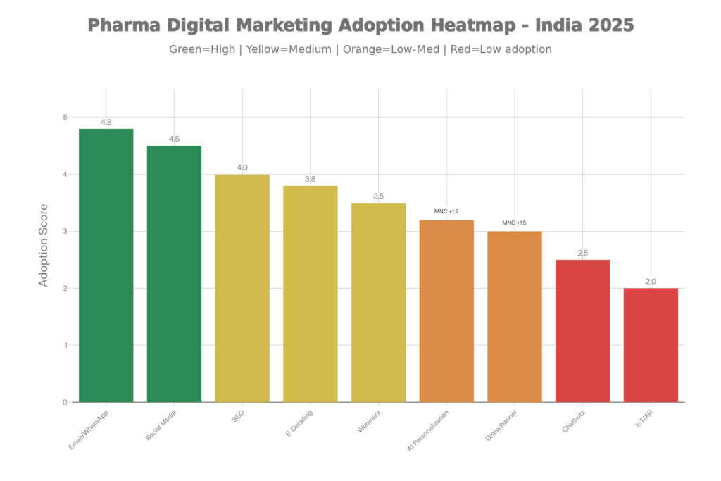 | MNC vs Indian firms | MNCs show higher use of AI, omnichannel, SEO, e‑detailing, online RWE. | Domestic firms should selectively adopt high‑impact tools rather than copy full stacks. |
